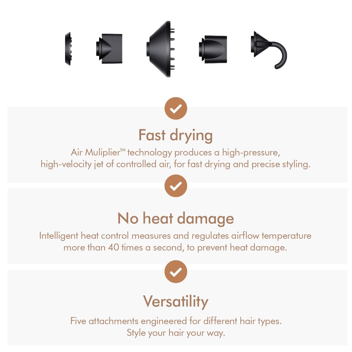 Intelligent heat control helps protect your shine:-The Dyson Supersonic hair dryer measures air temperature over 40 times a second, and regulates the heat. Preventing extreme heat damage, to help protect your hair's shine.