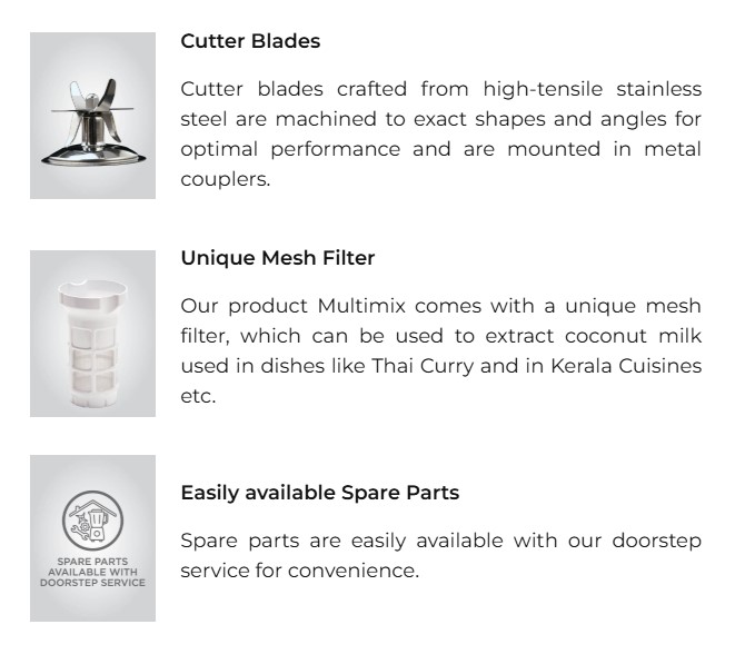 | • An unbreakable transparent liquidizer Jar for multiple uses like Shakes, Purees, Cold Coffee, Cocktails, Mocktails, Butter milk etc. This also includes a separate mesh filter which can be used to extract coconut milk used in dishes like Thai Curry and in Kerala Cuisines etc. |
