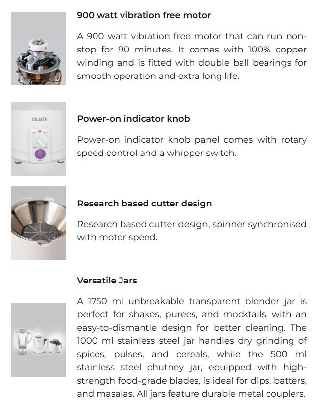 | Multimix is a popular Juicer-mixer-grinder model also known by the name Sujata 2in1 Mixi, which offers a mixer-grinder with fresh juice maker at price of any ordinary mixi . Hence, an absolute value for money product. The product comes with following accessories: |