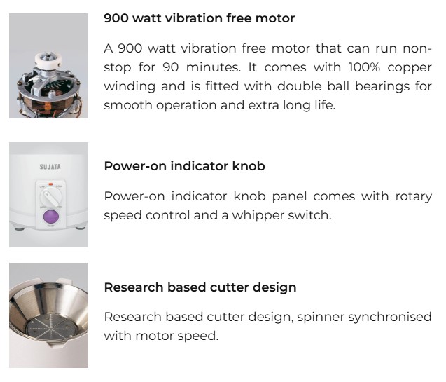 | Sujata Powermatic Plus is India’s most selling Juicer Mixer Grinder and also the flagship model. It is capable of smoothly executing the toughest of the tasks in any Indian Kitchen, making it a must-have kitchen appliance. It is low maintenance and trouble-free and hence the 1st choice for household use. The power of the motor is 900 Watts and comes with a double ball bearing motor technology. This Sujata’s centrifugal Juicer has a precision engineered low speed function to yield maximum juice from fruit / vegetable. The Juicer Mixer Grinder’s price is affordable and comes with following accessories: |