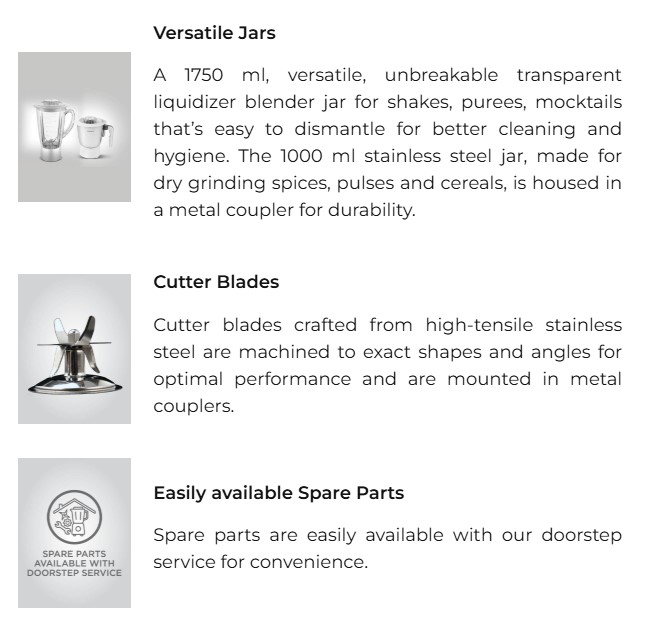 | Capacity of Jars | Blender – 1750 ml., Dry Grinder – 1000 ml. |
