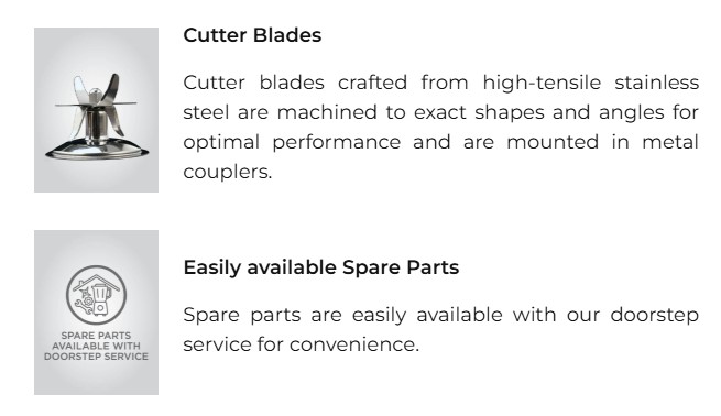 | Capacity of Jars | Blender 1750 ml., Dry Grinder 1000 ml., Chutney Grinder 500 ml. |