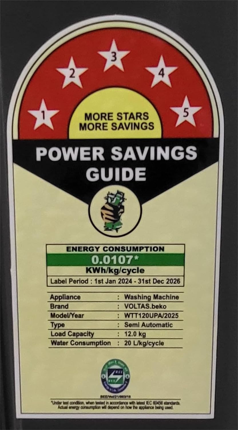 Voltas Beko, A Tata Product 12 Kg 5 Star Semi-Automatic Top Loading Washing Machine (WTT120UPA/BKSSDG5GTDA, Black, Pulsator Wash Method)